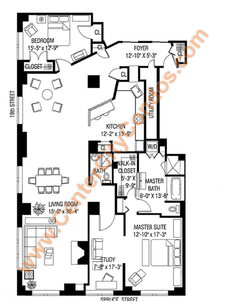Known as "Rittenhouse Place," this lovely Rittenhouse Square condo building sits just steps off the Square, on the corner of 19th and Spruce Streets. Housing many modern and fabulously appointed units, the apartments are well lit and spacious. Although most units at 275 S. 19th are condo flats, Rittenhouse Place has a few exceedingly rare bi-level units. Almost all the units here have 360-degree views. With only one unit per floor, and is one of Center City's latest residential high-rise condominium conversion projects, adding an excellent option to the Philadelphia real estate landscape. If you are considering a condo in 19103 zip code, Rittenhouse Place condos could be your next home.